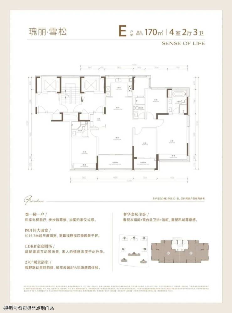 建面约170方户型实现“主卧小家化”,奢华套房式主卧,奢配衣帽间+双台盆卫浴+浴缸,同时配有大飘窗,采光和景观面不输大客厅。
