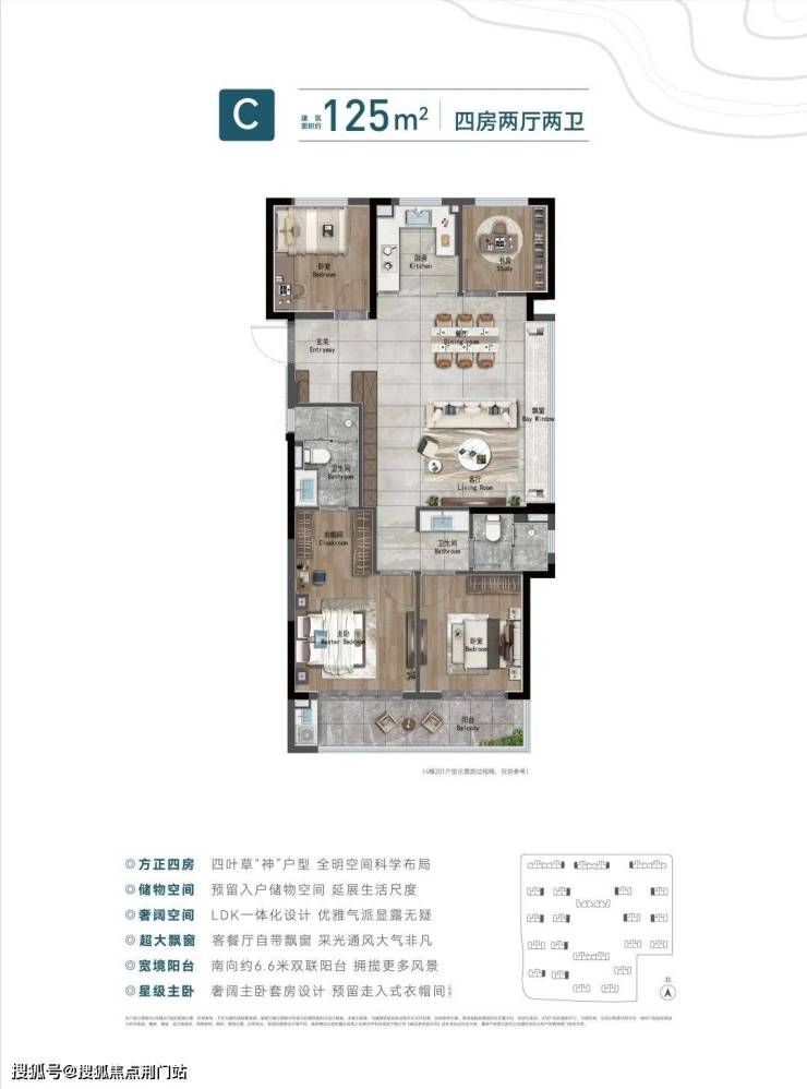 这款户型是建面约98方的升级款,多了一个北房间,且各空间尺度更豪华。