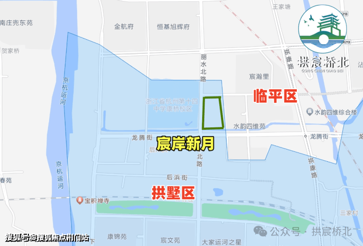 绿城·宸岸新月,也就是运河新城单元 GS1001-05地块,它位于拱墅区康桥街道龙腾街与丽水北路交叉口,步行距离在建的15号线龙腾街地铁站约650米。