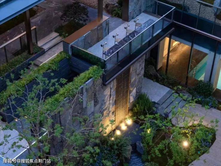 昂贵的黑松和羽毛枫分立两侧,四角是设计师精挑细选的乌桕树,中间叠水曲折辗转,宛若自然秘境。