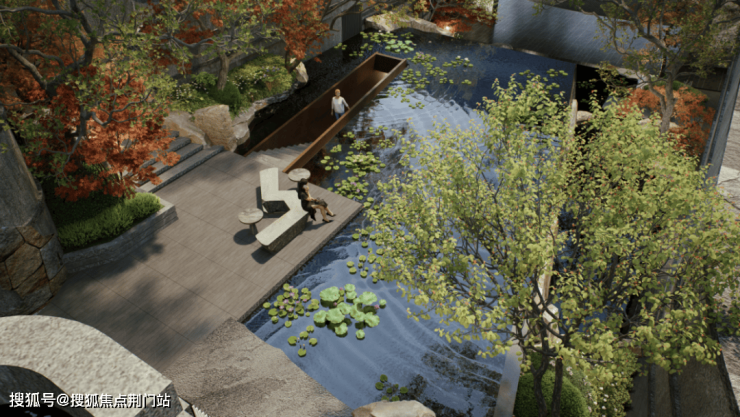 北侧的云溪阁顺应高差悬浮于入口,化解高差的同时,形成了独特的空间。贯穿南北的溪谷主轴,把两侧的合院与叠墅紧密联系,也实现了从莫奈花园到东方秘境的过渡。