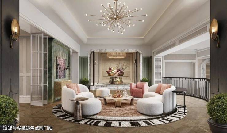 设计传承法式浪漫精髓:对称布局与经典比例展现宫廷美学;浅色大理石与丝绒材质在自然光影中呈现细腻层次;精致线脚与弧形门廊勾勒空间轮廓,水晶灯饰与艺术陈设点缀其间。