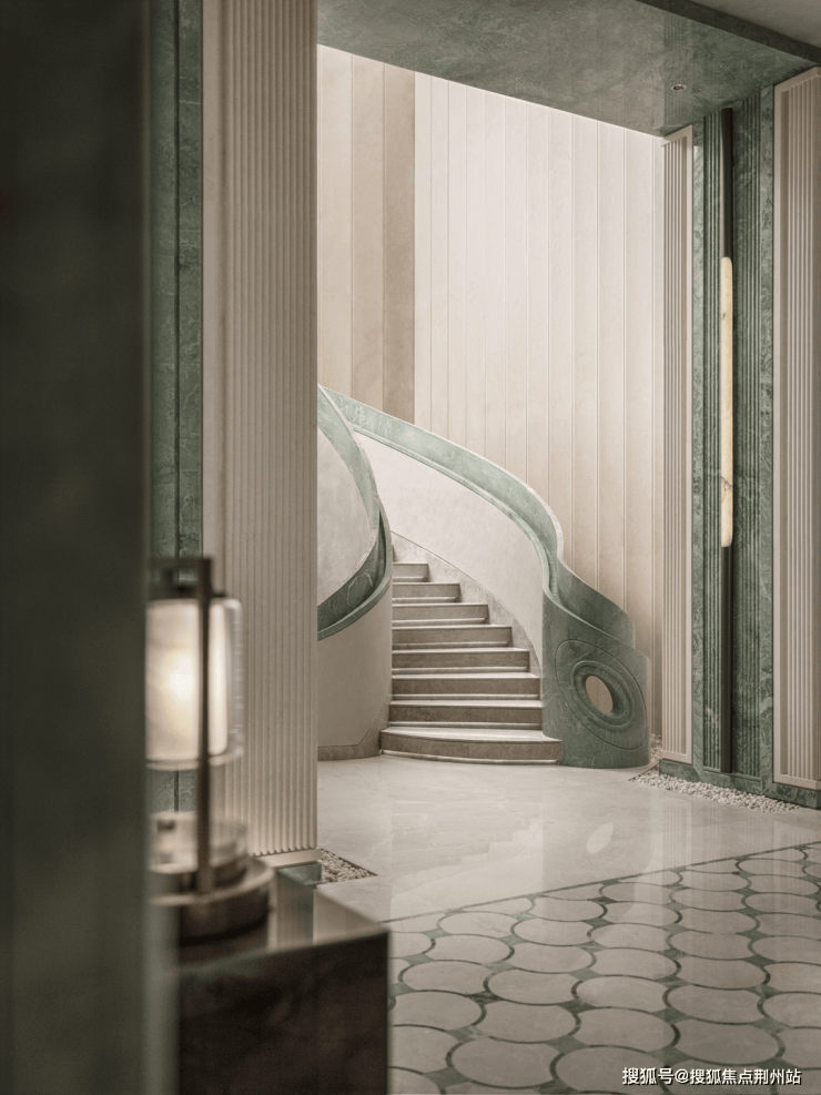 旋转楼梯中央,玉石灯柱如垂瀑而下。光影在每一寸玉质间律动、折射。