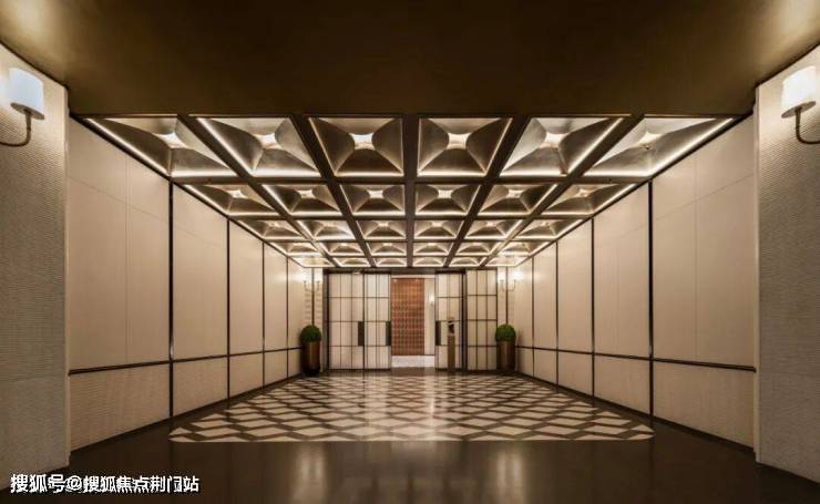 主入口吊顶借鉴古代建筑中的”藻井“元素,在形式上加以简化,运用皇家白玉石材等现代材质,方正通透,符合现代审美。