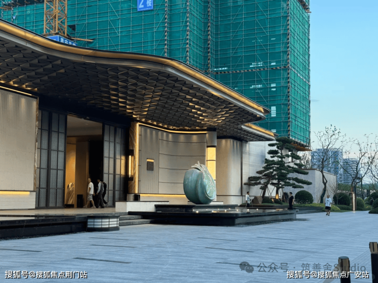 御潮印的门头是板块内最大的,宽达60米,高约6.8米,很大气的。价值百万的迎客松,搭配3.4米高的云石灯,铺陈进口孔雀玉、贝金米黄等奢石,与奥映鸣翠同款石材相得益彰。香槟色龙鳞铝板吊顶,千片龙鳞精密排布,更显恢宏气度。