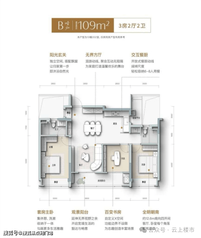 主卧套房配备卫浴、衣帽间与飘窗,晨起护肤品与睡前读物各有归处;双阳台与多飘窗的“赠送空间”,让实际使用面积远超预期。格局上做到方正通透、动静分离,无论是二人浪漫派对还是二孩家庭的热闹日常,收纳系统都像 “隐形管家” 般维持秩序感。109方B1户型更是做到大面宽,四开间朝南,把阳光塞进每一个房间。
