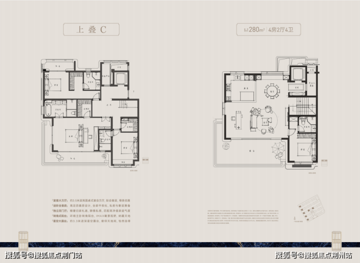 全套房设计,提升居住舒适度。上下叠各有ABC三种户型,面积在212-280平之间,且所有户型为全套房设计,主卧更是可实现“小家化”布局,家庭成员各有一方私密天地,享受更加舒适、静谧的墅居生活体验。