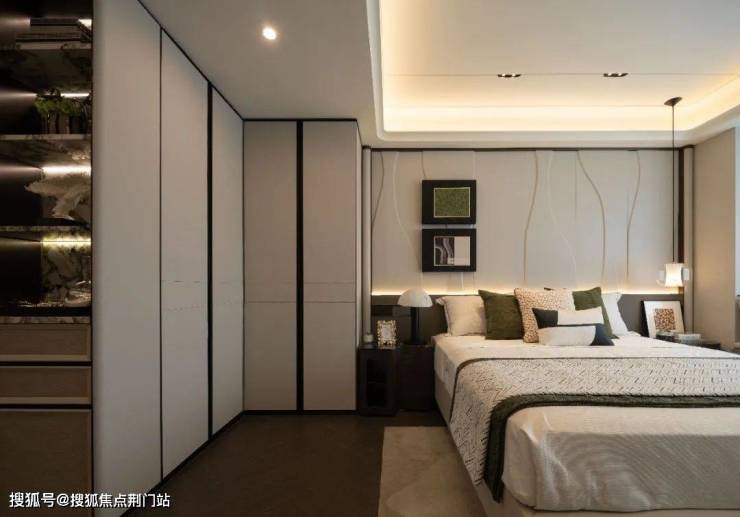 最后,是它藏在细节里的“美商”。全屋无主灯设计+弧形吊顶,客厅和主卧做了“双背景墙”。玄关柜、主卧衣柜全是交标,用上了编织纹皮革+冷翡翠岩板。