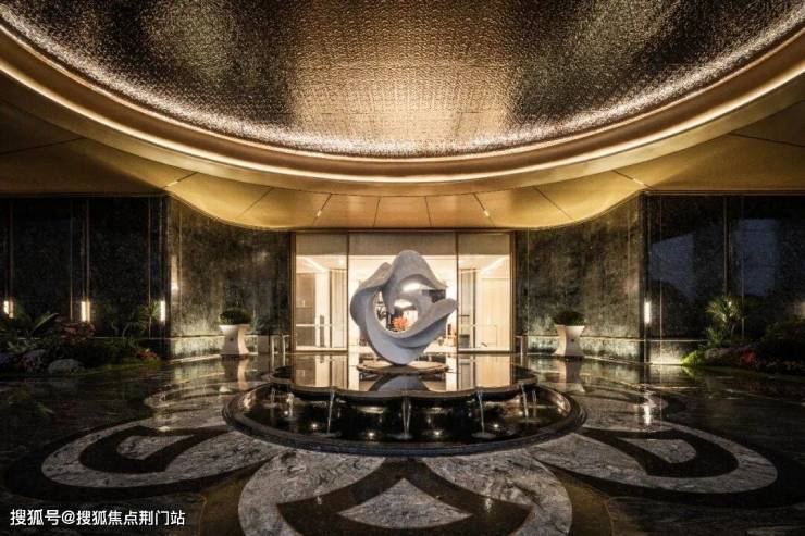 最具仪式感的应该是大门入口处:宽约35米、高约6.5米的寰宇云厅,如殿堂一般气势恢宏,两侧还有挪威蓝翡翠石材景墙对仗而立。