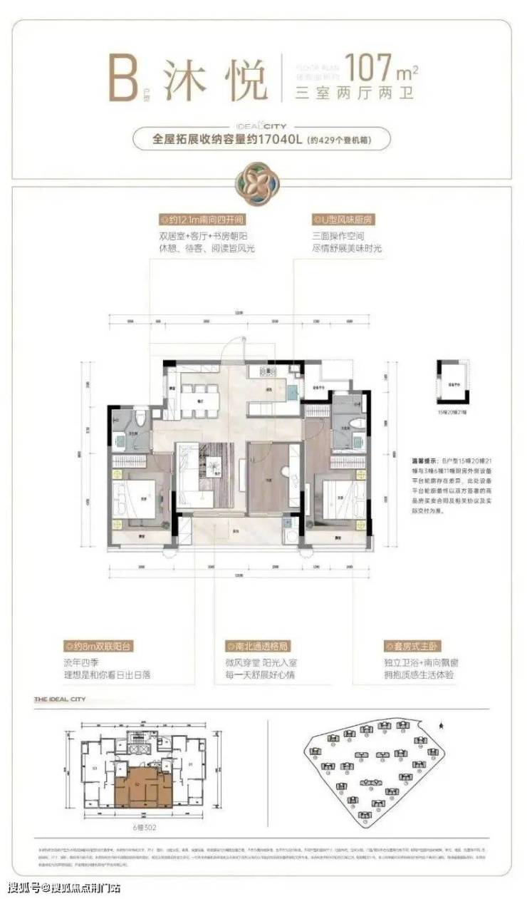 建面约107㎡户型,则把重点放在舒适度上。阔绰方厅+双联阳台,通风赏景至佳,还有U型厨房,三面操作空间,动线流畅好用;套房式主卧更配置了步入式衣帽间,独立卫浴设计,保证了主人家的隐私和仪式感。