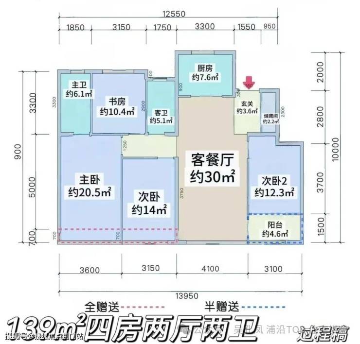 - 13.95米南向采光面:四开间朝南,阳光从早晒到晚,连玄关都亮堂;