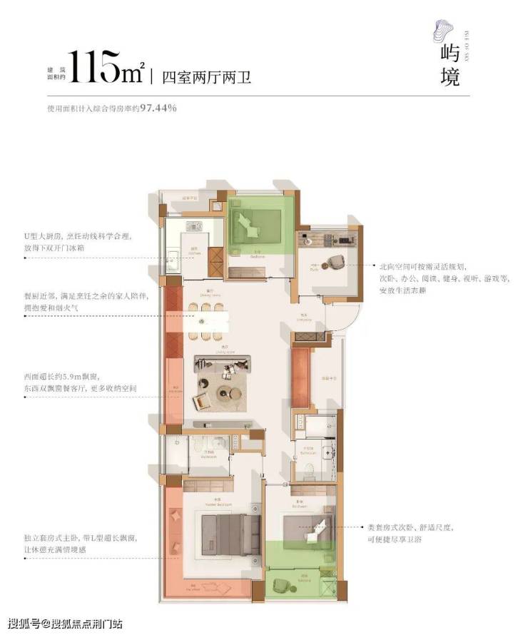 大量赠送面积的拓展,使其拥有约97.44%的超高得房率,堪比市场面主流约150㎡+户型的实用空间。