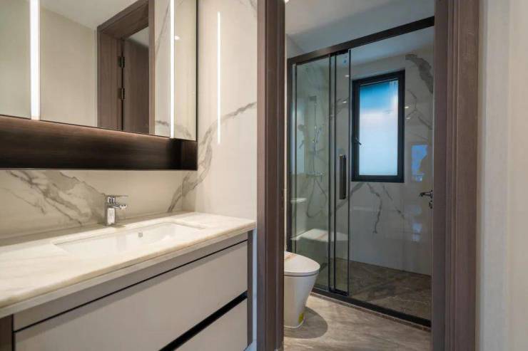 主卫配了酒店式壁挂智能马桶,市面上很少见。卫浴间配置了线条式暖风机、汉斯格雅花洒+顶喷、自带加热除雾功能的通长镜柜、天然大理石台面,太奢侈了。