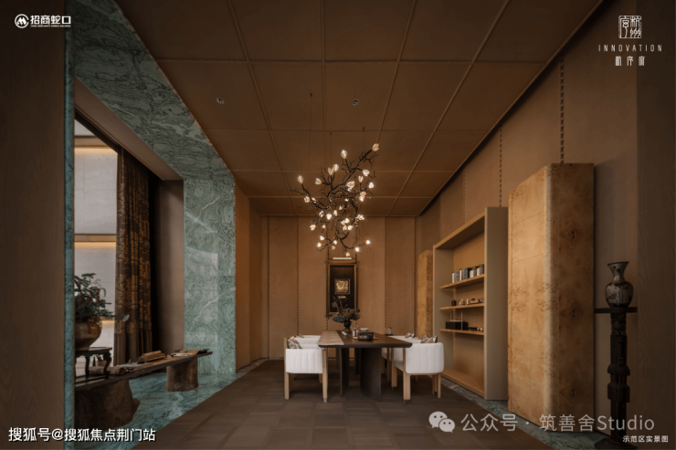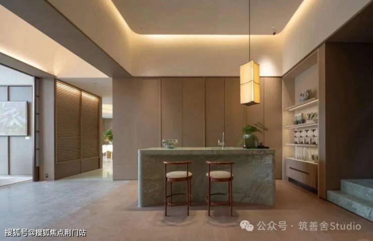 私宴,以撞色绿色石材打造的景墙巧妙划分出休憩与用餐区域,既巧妙掩盖了空间中的柱子,又破解了宽阔空间的单调感。拱券天花与墙面波浪板的和谐呼应,既彰显了空间布局的层次感,又打破了传统对称的僵化。淡雅的硬装色调搭配深邃的中古家具与软装,简约而不失格调,视觉体验清新自然,避免了过度夸张。