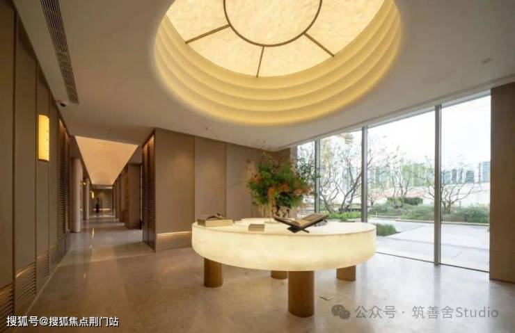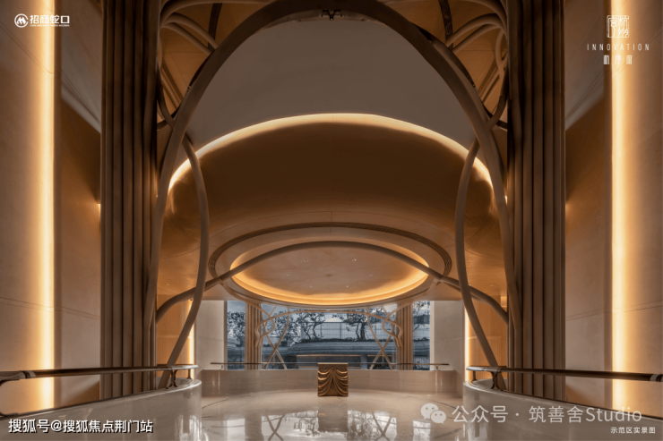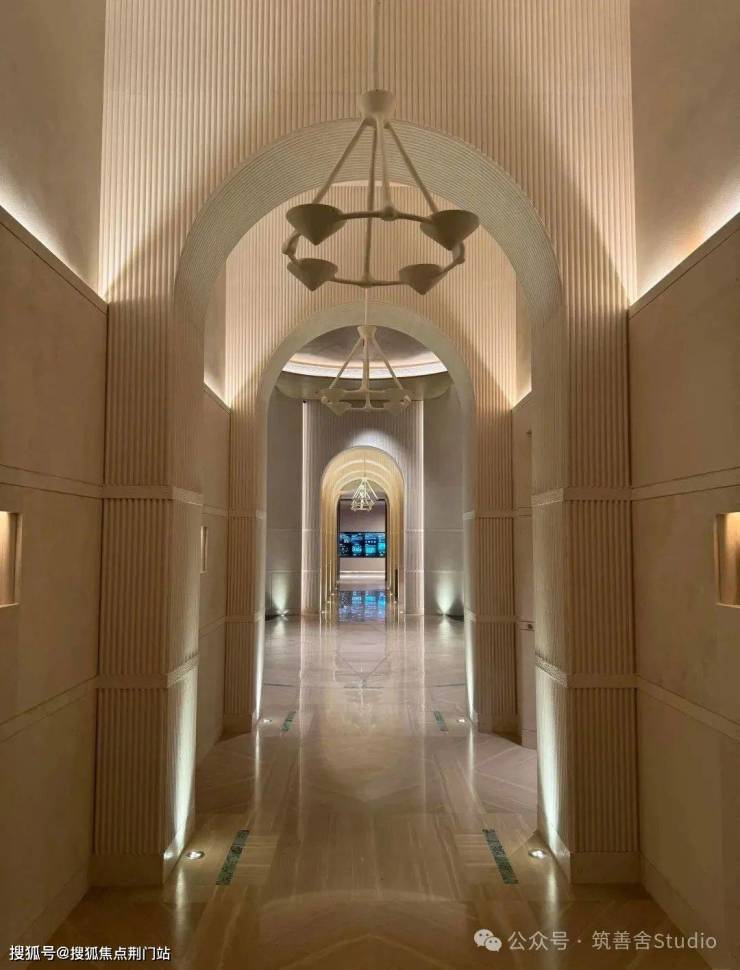 杭序府匠心独运,打造别具一格的「溪谷」门厅,一眼难忘,令人印象深刻。灵感源自九溪烟树的幽深谷景,采用曲面石材景墙搭配香槟金属线条,宛如潺潺溪水般灵动。上方矗立一座气势恢宏的扇形华盖,名为【沧浪华盖】,其错落有致的造型自然勾勒出入门的峡谷景观。流畅的宽阔弧线,起始于主入口处月光米黄的石材(主入口两重门厅的景墙,就用掉了近1000m³月光米黄石材)双曲面墙体,以其独特的气势,强势横跨整个空间。