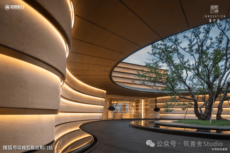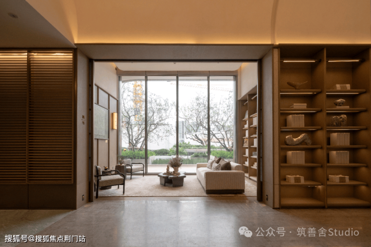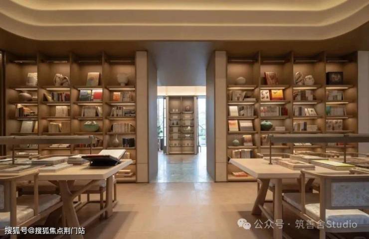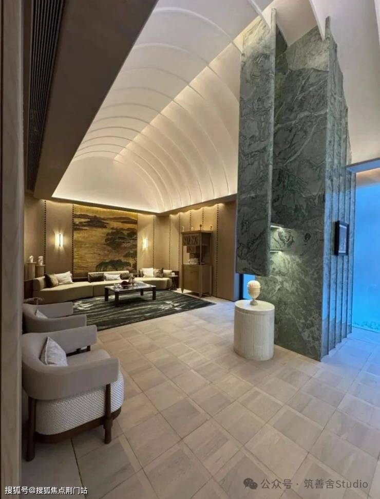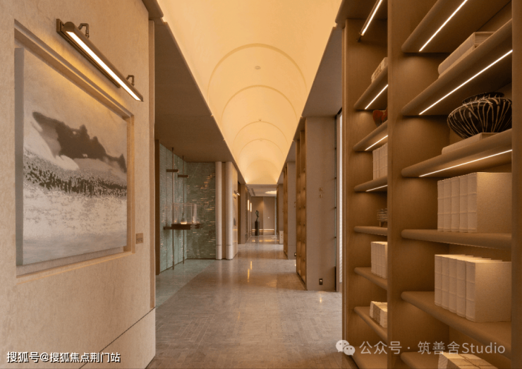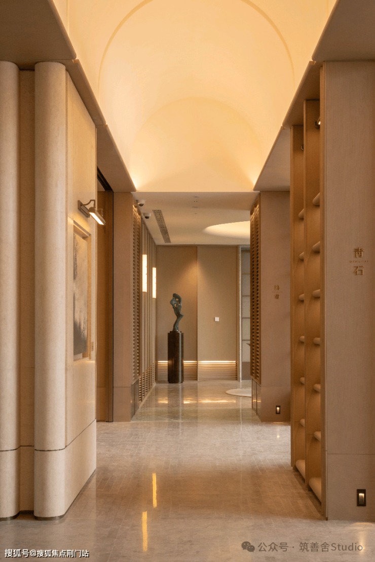 架空层精心打造,携手西泠印社,以书吧、休闲区、会议室为核心文化载体。特色拱圈长廊巧妙连接两侧空间,墙面装饰或为实用书架,或为璀璨发光的石材,亦或为营造度假气息的精致格栅,营造出多元化的空间体验。同时,注重屋顶与地面软装的和谐搭配,提升整体空间美感和舒适度。