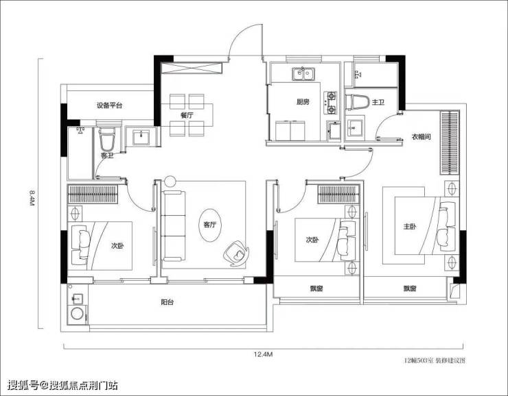 南向面宽12.4米,三个卧室全朝南,双联阳台,小夫妻或三口之家够用。