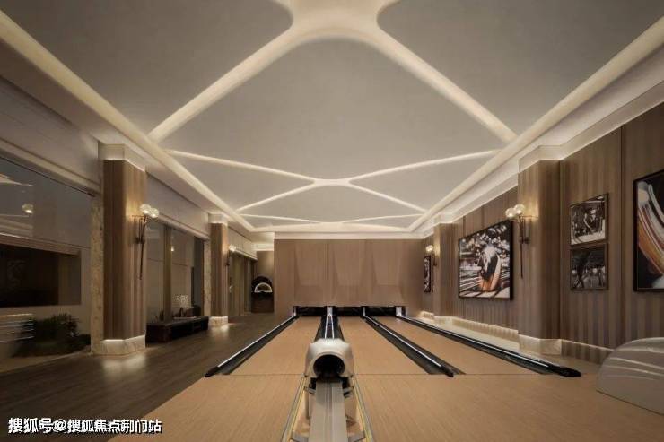 开阔场域内,跑步机阵列与绿植幕墙形成视觉韵律,以典雅东方美学为基底,融合现代奢华设计语言,几何线条勾勒刚柔并济的视觉层次,暗合保龄球运动中力与美的平衡哲学。
