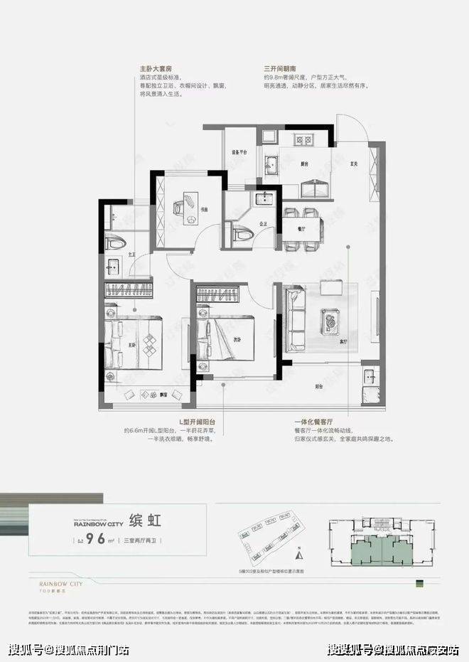 建面约96㎡的三房户型,在倾力打造实用之际,亦没有忽略掉生活中必要的舒适感,比如显著实现生活小确幸的独立书房,比如南向总面宽约9.8米、宽约6.6米的南向L型双联阳台,阔绰的阳光尺度,让你尽情享受园区景观的同时,居家空间的每一个季节都是风格日丽。
