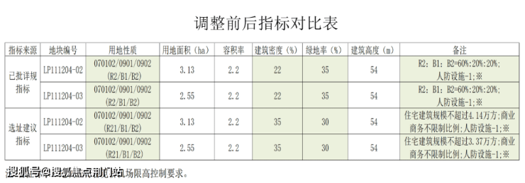 此次调整包括建筑密度从22%调整为35%,绿地率从35%调整为30%,用地面积、容积率以及建筑高度均不变;此外,地块取消商业、商务面积占比分别为20%、20%的限制。