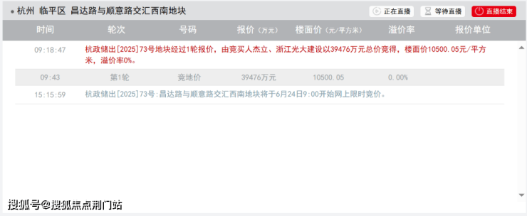 东湖新城单元LP111204-03地块经过1轮报价,由竞买人杰立&浙江光大建设以39476万元总价竞得,楼面价10500.05元/平方米,溢价率0%。