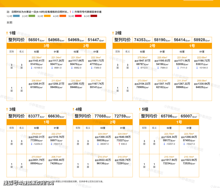 具体来看:1幢8套房源,均价54354元/㎡;2幢8套房源,均价62681元/㎡;3幢4套,均价75905元/㎡;4幢4套,均价74631元/㎡;5幢4套,均价65135元/㎡。