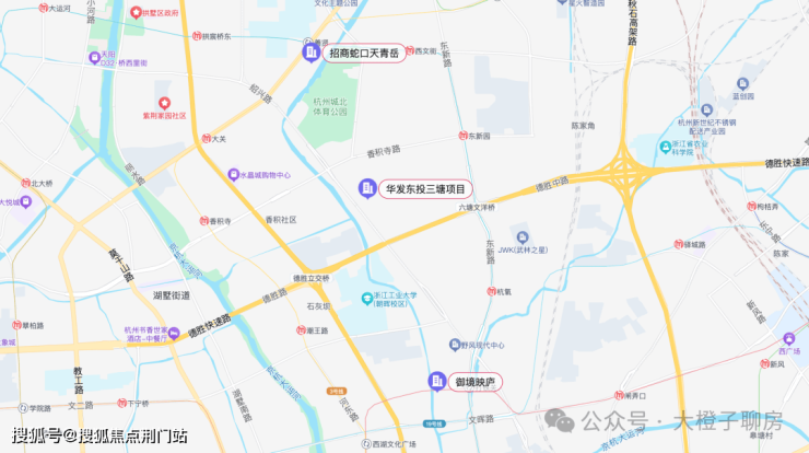 项目周边配套成熟,居住氛围浓厚。距离在建地铁15号线三塘站仅约300余米,江河汇、世纪城均可直达。同时周边德胜快速路、绍兴路等主干线环伺,交通便捷。距离武林广场也仅约3公里,真正处于"杭州顶级生活圈"范围内,区位价值十分突出。