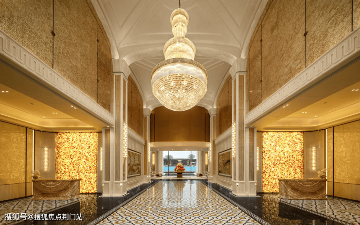建筑外立面以“金朱丹玉”为主调,铺陈“罗琳红”奢石上墙;入口两侧,“安第斯雪景”大面展开,恍若踏进一场盛大的鎏金梦境。