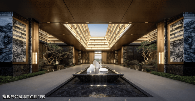 中心华盖之下,是汉白玉整石为主景的叠水,寓意着藏风聚气又纳财;左右两边的华盖下方,则做了诗意的堆坡造景,两棵铁冬青就像展品一样精致。