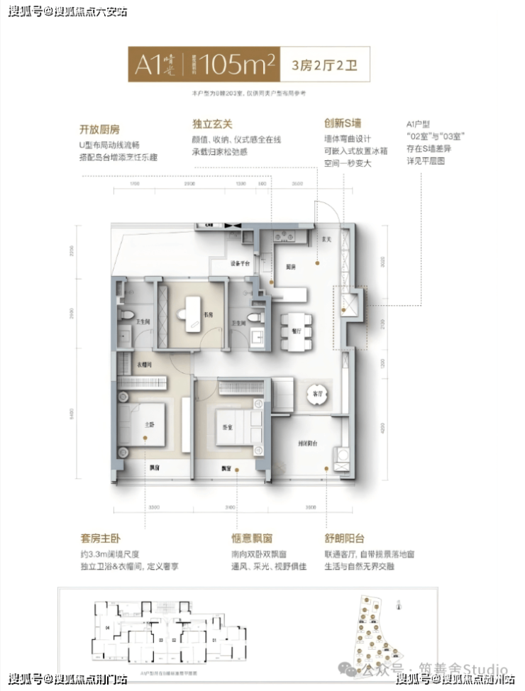 建筑面积105㎡户型,独立玄关空间,集美观、收纳、仪式感于一身,营造归家的舒适与放松。开放式厨房设计,U型布局流畅自如,岛台搭配,烹饪时光充满乐趣。创新S型墙面设计,弯曲造型巧妙,嵌入式冰箱放置,空间利用更高效。套房式主卧,约3.3米宽敞尺度,配备独立卫浴与衣帽间,尽显奢华享受。南向双卧室配备双飘窗,通风、采光、视野三者兼具,尽享舒适生活。宽阔阳台连通客厅,配备揽景落地窗,生活空间与自然美景无界交融。