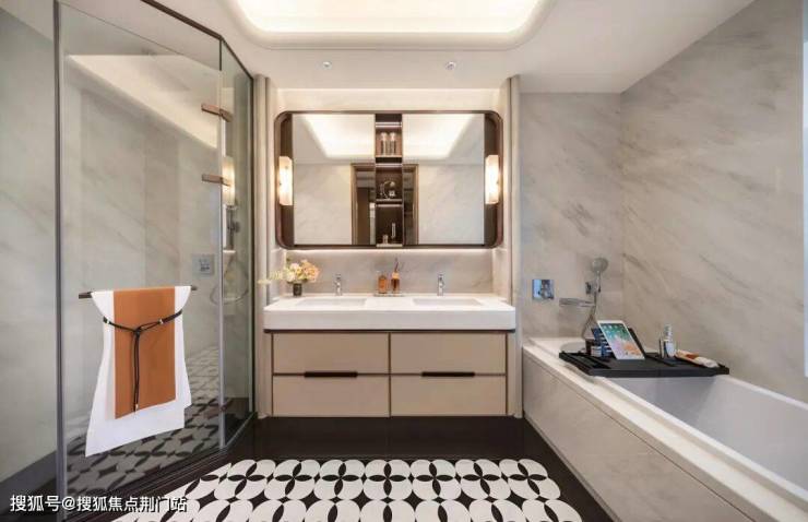 主卧带独立衣帽间+双台盆主卫,主卫同时配备浴缸和淋浴区,还带窗户,做到了真正的干湿分离,隐私性和舒适度拉满,是豪宅级别的主卧配置。