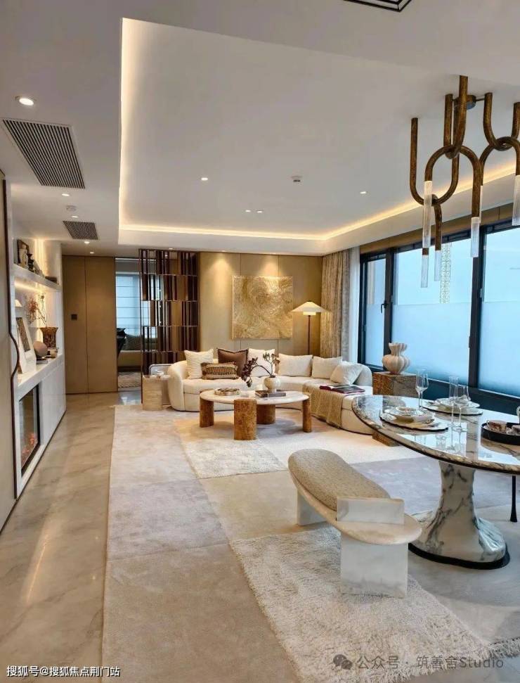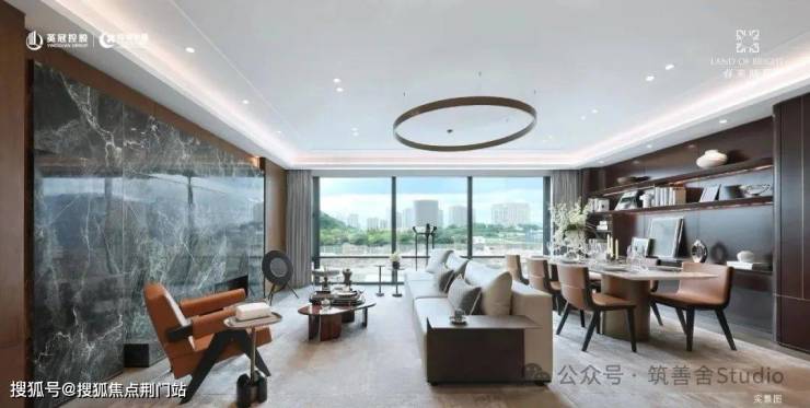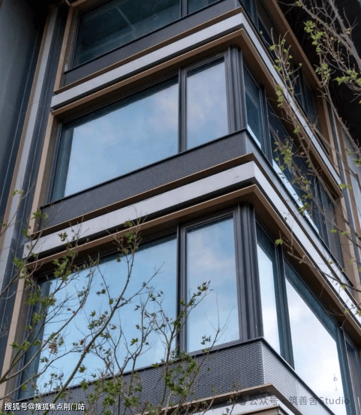 项目建筑宥九米建筑设计院设计,其立面设计沿袭锦庐系经典公建风貌,精选四面铝板与广阔玻璃相结合,打造出封装阳台的精致与通透明快感。底层选用浅色调天然石材,巧妙融入圆弧设计元素,彰显出空间的优雅与品味。这种极致细腻的金丝画框设计,四边以高品质金属铝板环绕,搭配全景玻璃幕墙,既彰显通透之美,又体现现代风格,香槟金与深灰的优雅搭配,令整体外观更显高贵气质,颜值是很不错的。