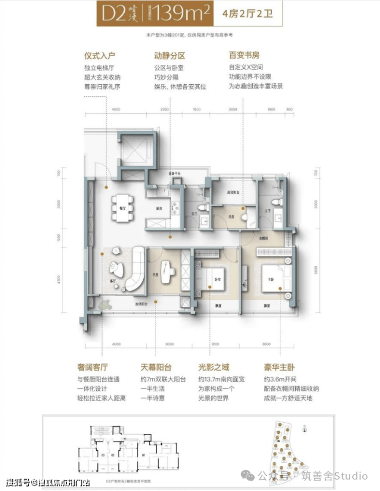 建筑面积139㎡户型,约13.8米四开间朝南,沐浴阳光,温馨满屋,共筑全家人的温暖时光。尊享仪式入门,独立电梯前厅,超大玄关,收纳无忧,彰显归家尊贵礼仪。宽敞竖厅,客餐厨一体化设计,空间进深达10米,聚会娱乐,从容自在。多功能书房,自定义空间,无限可能,打造个性化生活场景。豪华主卧,约3.6米宽敞面宽,设施完备,赋予生活更多精彩。宽阔景观阳台,休闲与实用空间巧妙分区,趣味与舒适并重。