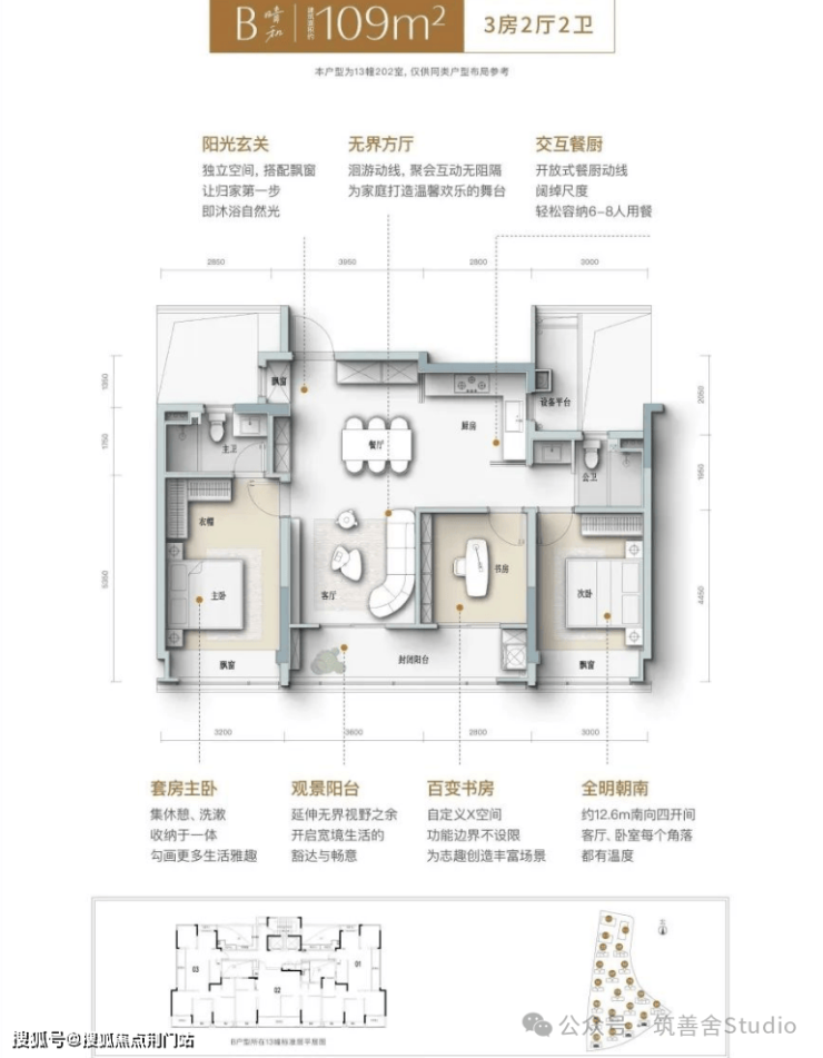 建筑面积109㎡户型,阳光引航玄关,独立空间巧配飘窗,入门即享温暖阳光的拥抱。无界客厅,流畅洄游动线,畅享无间互动,打造家的温馨欢乐场。约12.6米南向四开间,客厅卧室每个角落充满温馨。互动式餐厨,开放式空间容纳6-8人,共聚温馨时刻。观景阳台,拓宽视野,开启无限生活境界。