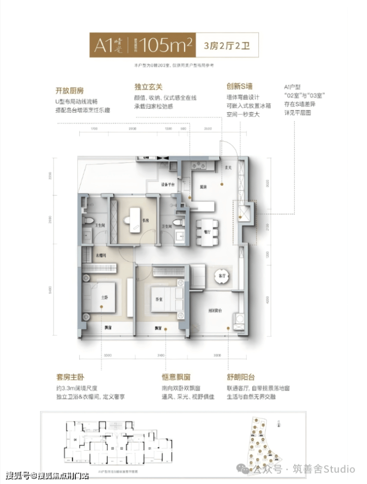 建筑面积105㎡户型,独立玄关空间,集美观、收纳、仪式感于一身,营造归家的舒适与放松。开放式厨房设计,U型布局流畅自如,岛台搭配,烹饪时光充满乐趣。创新S型墙面设计,弯曲造型巧妙,嵌入式冰箱放置,空间利用更高效。套房式主卧,约3.3米宽敞尺度,配备独立卫浴与衣帽间,尽显奢华享受。南向双卧室配备双飘窗,通风、采光、视野三者兼具,尽享舒适生活。宽阔阳台连通客厅,配备揽景落地窗,生活空间与自然美景无界交融。