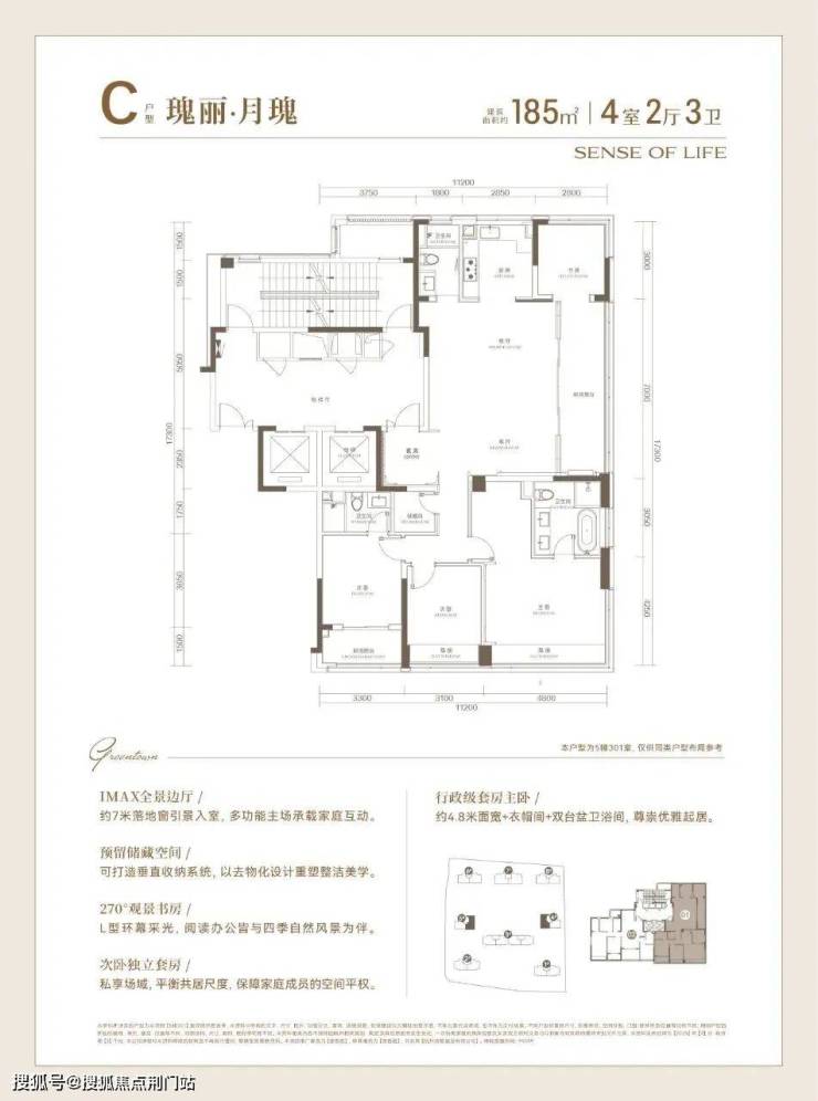 建面约170方户型实现“主卧小家化”,奢华套房式主卧,奢配衣帽间+双台盆卫浴+浴缸,同时配有大飘窗,采光和景观面不输大客厅。