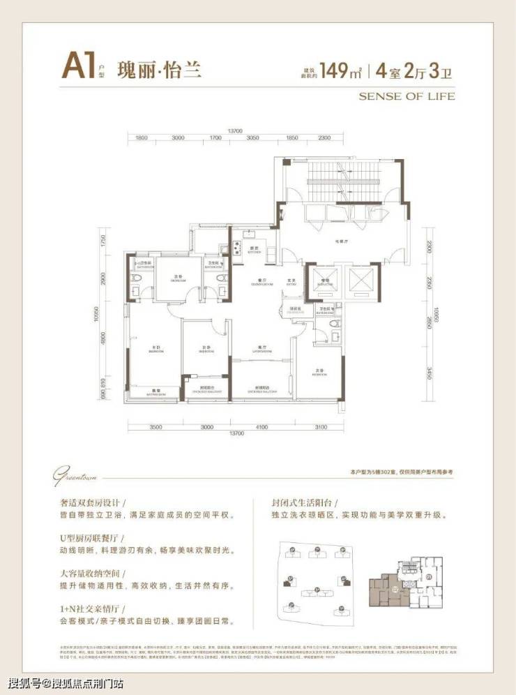 奢适双套房设计,是兼顾家庭成员的私密天地;大餐厅、1+N社交厅、南向封闭式阳台完美融合,形成全家人欢聚的超级大公区。