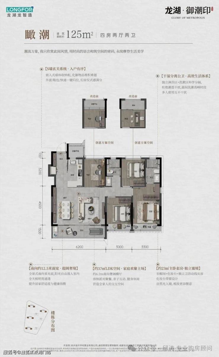 龙湖御潮印占地约2.5万方,打造纯粹的7幢高层,错落排布出约494户住宅社区。