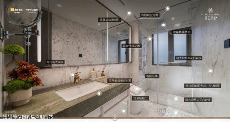 还不止,大到豪宅才有的嵌入式冰箱,小到顶喷花洒、主卧镜柜里的美妆冰箱等,都是交付标准,就连次卫也首次配置上了智能马桶;不断映入你眼帘的,还有各种木饰面、奢石、岩板,以及定制款龙头、门把手.....
