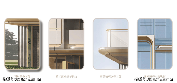 细节之处,大量弧角工艺的处理,特别是高辨识度的定制化弧形线脚,最大程度上消解了建筑的硬朗感,与香槟色铝板勾勒的流畅轮廓,相得益彰。