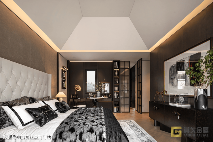夸张的还有层高,一层约3.6米,二层也有约3.2米,主卧的穹顶最高处更是达到了4.8米,配上大屏落地窗,气场十足。
