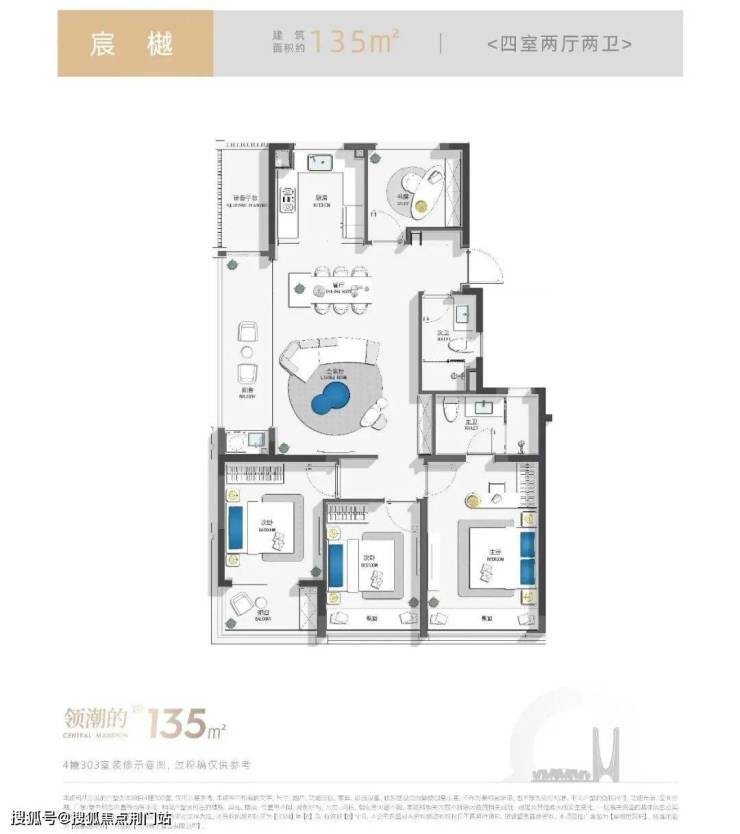 以建筑面积约135㎡为例,深研当代精英家庭的居住空间需求,将客、餐、厨三大空间合并,创新一体化PARTY聚场;大视界阳台、酒店式主卧套房,奢享沉浸式的尊崇起居场景;精致细节考究,臻选国际品牌,让艺术审美嵌入,定制时代有为者的前沿品味,启幕世纪精致新序。