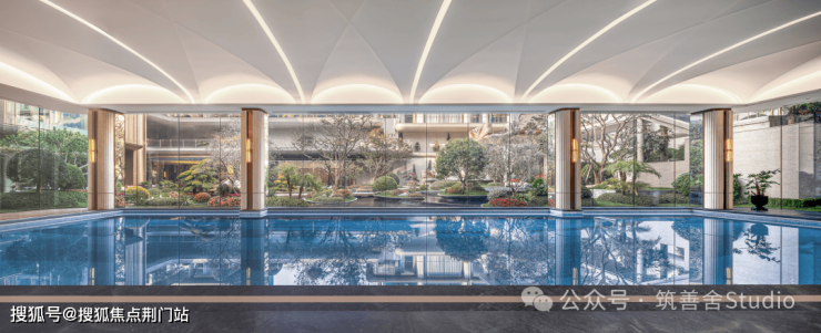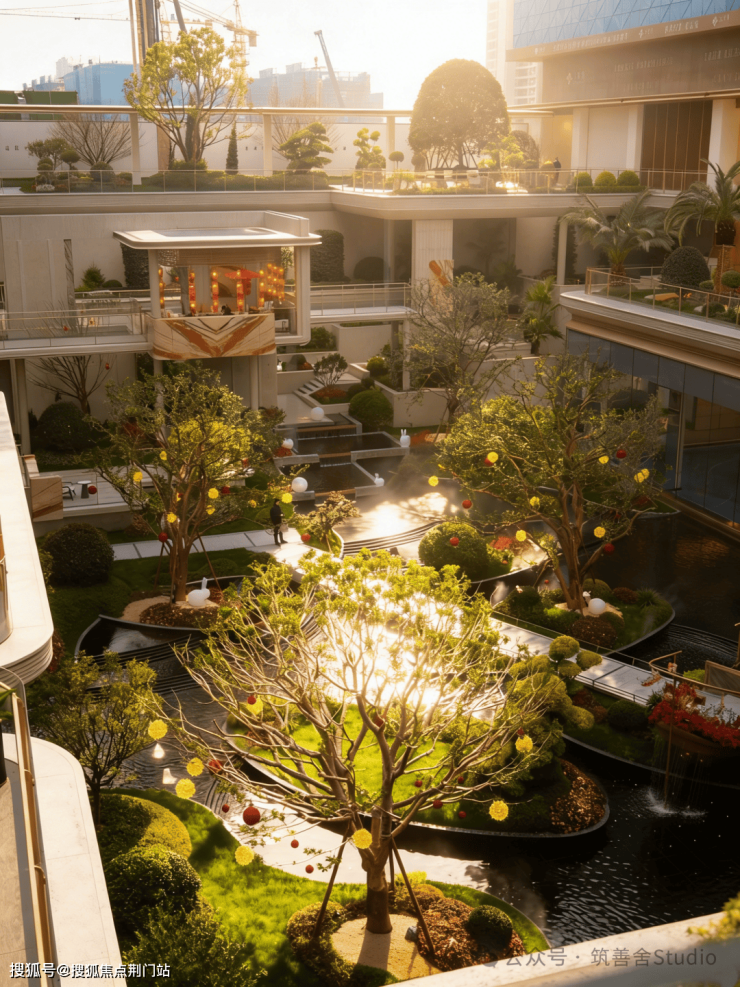 小区大门以“云扉初开”为灵感,打造具有仪式感的礼仪入口。宽约66米、高约8.6米的恢弘门庭,与酒店式归家大堂共同构筑,打造出极具仪式感的序厅,瞬间开启归家的尊崇心境。入口处精心打造的树阵水院,以静谧尊贵的氛围迎接归家。巧妙运用高差设计,通过层层递进的景观节点,优雅地引导业主步入社区深处。