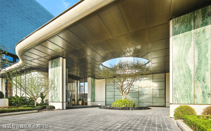 主入口大门高度达到了约7米,置身其中,尊贵气派。选用贝金米黄石材、维多利亚绿与白雪公主奢石,搭配古铜色金属板,巧妙融合冷暖色调,营造出极具张力的美学效果。