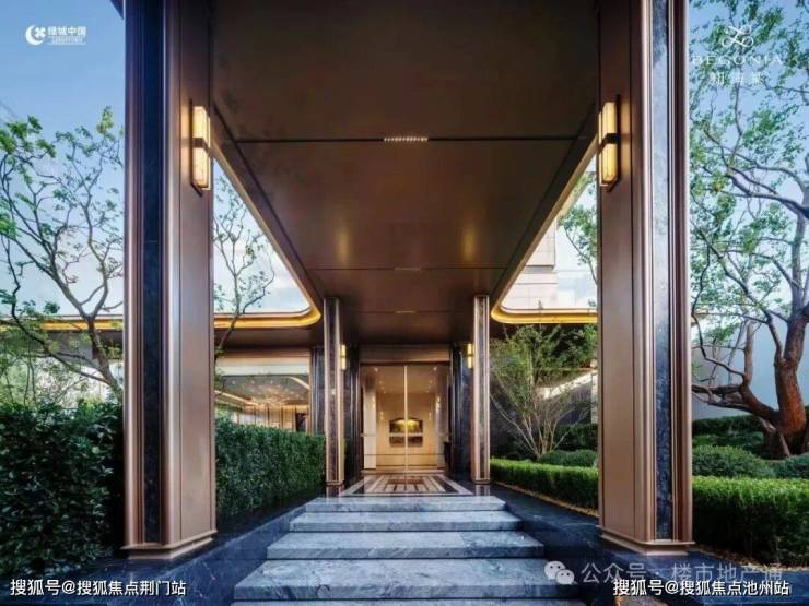 通过门廊,采用透光吊顶,通透感更强,来到归家大堂,落地玻璃外就是大片水系