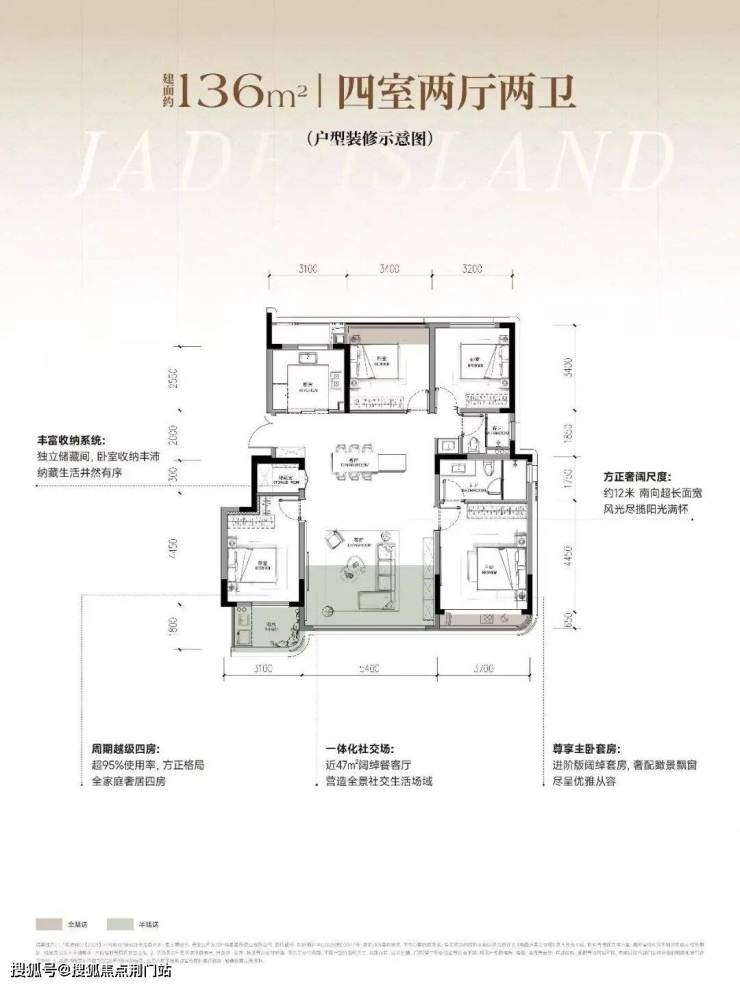 客厅约47方,接近市面上190方才有的户型尺度。
