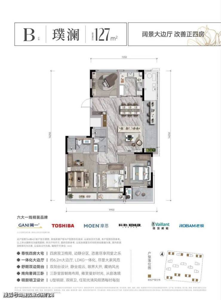 建面约127㎡户型,市场面上罕见的三房朝南纯边四房户型,边厅大阳台,带约6.2米边厅+宽景阳台,南向面宽达到近10米,朝南的三个卧室,每一个都配上了飘窗或阳台。