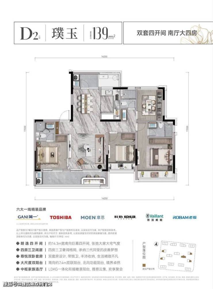 建面约139㎡户型,四房三卫,东西各有一个套房;餐客厅一体,公共区域非常大,而且还是南北双阳台;南向开间约14米3,完全是大宅尺度,三代同堂居住也不会拥挤。