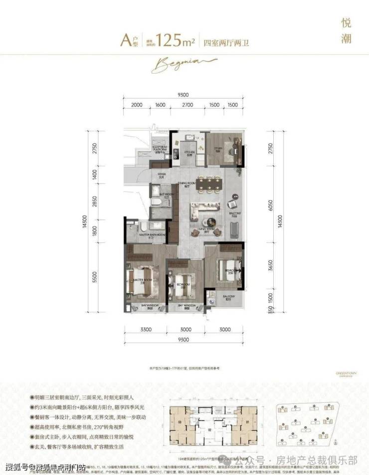 125㎡A户型·四房两厅两卫,尊享6米超宽边厅,客餐厅无缝衔接,打造一体化宽阔景观空间。三卧室均朝南,尽享约9.3米南向超大尺度,配备充足储藏空间。书房特设转角玻璃窗,沐浴自然光景,品味生活美学。