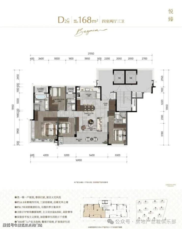 168㎡D1户型·四房两厅三卫,尊享一梯一户归家礼序,创新设计引入光之宴会厅南北双向对流,四开间朝南,面宽扩展至约16.8米,格局方正雅致,配备充足收纳空间,主卧配备270°全景视野,尽享景观盛宴。